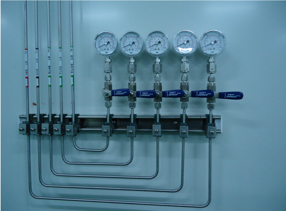 (2)集中供气是将各种实验分析仪器需要使用的各类气体钢瓶,全部放置在实验室以外独立的气瓶间内,进行集中管理,各类气体从气瓶间以管道输送形式,按照不同实验仪器的用气要求输送到每个实验室不同的实验仪器上。