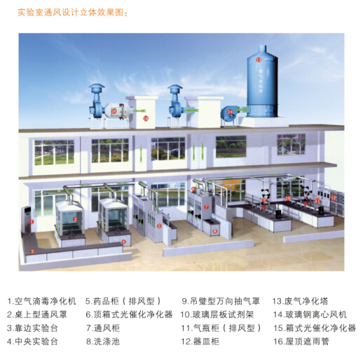 这种通风系统组成复杂,每台通风柜的配制有感应装置、中央处理系统和执行装置,当风柜拉门改变高度时,中央处理系统接受到来自感应装置的信号,则控制执行装置完成动作达到改变抽风量的目的。适用于大型研发中心或实验室通风柜数量较多的实验室,可以在后期使用过程中,有效节省能源,降低运营费用。