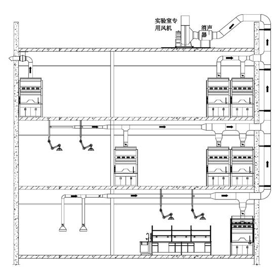 实验室通风要求新风全部来自室外,然后100%排出室外,通风柜的排气不在室内循环。化学实验室换气要求每小时大于10次,物理实验室每小时大于10次,实验室无人时换气可减少为6次。实验室通风柜设计数量要足够,并且不作为唯一的室内排风装置,仪器室或产生危险物质的仪器上方设局部排风系统